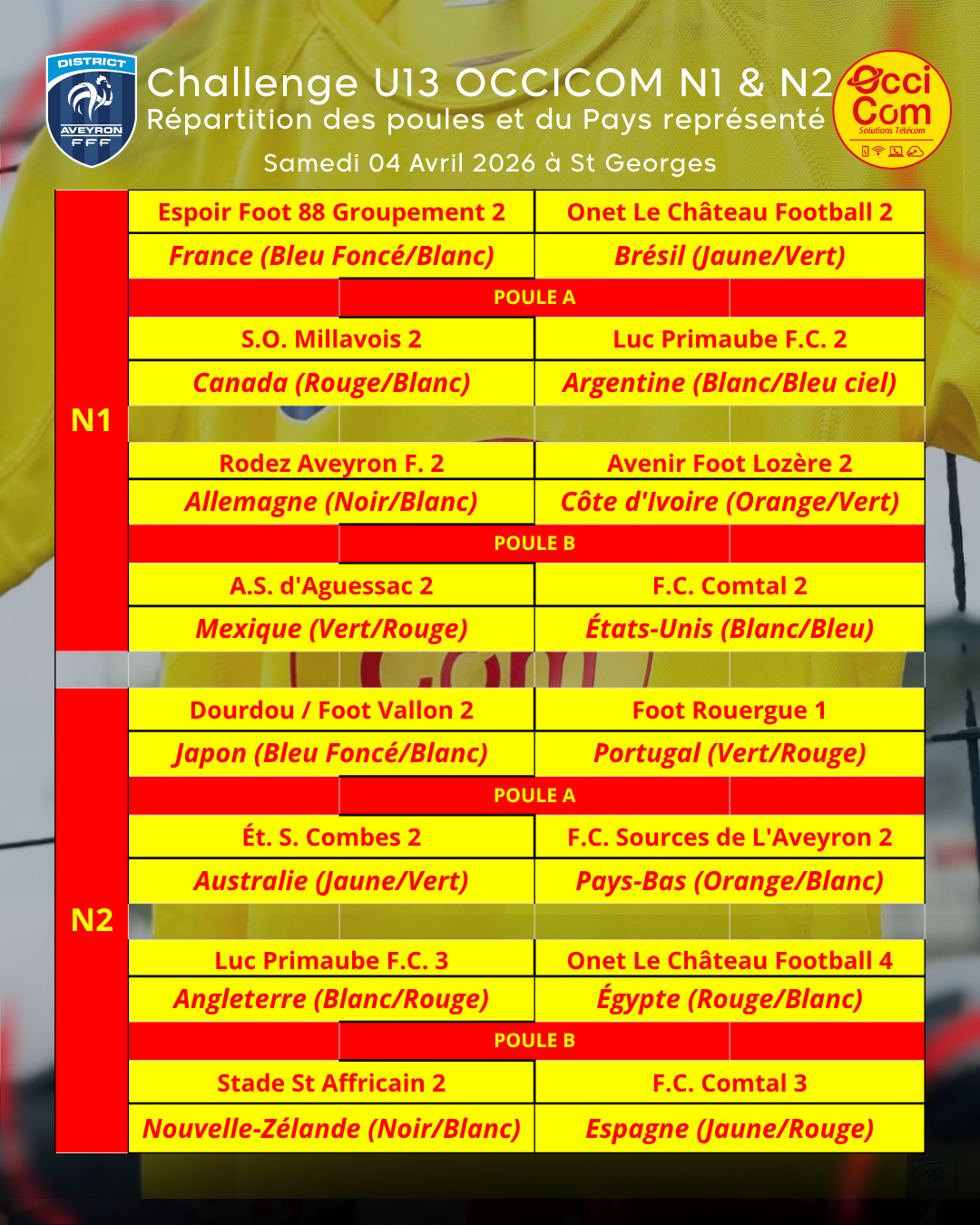Suite au tirage au sort des Poules les Finales N.1 et N.2 du Challenge U13 Occicom, réalisé le Mardi 10 Mars (en direct sur la page Facebook du District, possibilité de revoir le tirage via le lien suivant => https://www.facebook.com/share/v/1CTygEpUms/), vous trouverez en pièces jointes les documents relatifs à l’organisation de cet événement, qui aura lieu le Samedi 4 Avril 2026 à St Georges de Luzençon :