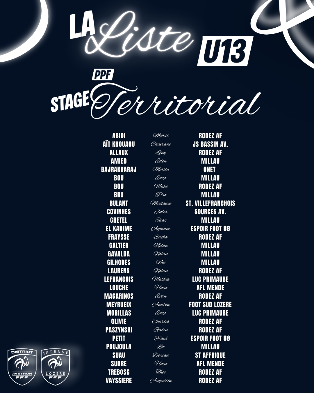 Dans le cadre du Projet de Performance Fédéral (P.P.F) U13, le District Aveyron Football a le plaisir de communiquer la liste des joueurs retenus par l’Équipe Technique Départementale pour participer au stage territorial.